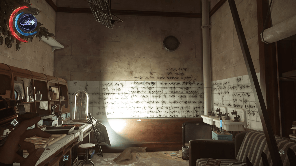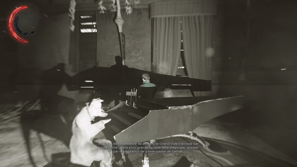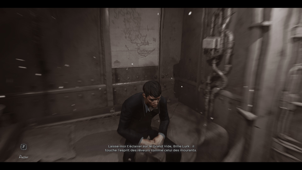 Cependant, l’Outsider ne limite pas à une copie de Dionysos; il possède un lien très important avec le temps. Le jeu se passe pendant une révolution industrielle steampunk3 et l’Outsider apparaît en premier lieu comme un témoin du passé en lien avec une tradition animiste et le monde des légendes (et du songe). Son rapport au passé se traduit aussi par le lien entre les baleines et le Grand Vide; la mise à mort en masse des baleines pour l’industrialisation les rattachent au passé. Cependant, peu à peu, le lien avec le passé disparaît au profit d’une nouvelle conception du dieu: il est en fait lié au passage du temps. Bien qu’il puisse avoir un certain don de divination, l’Outsider ne connait pas le futur de manière certaine et s’intéresse par conséquent à ceux qui écrivent l’Histoire -que ce soit Corvo, Emily, Daud, Delilah ou Billie, ils sont des nœuds dont dépend le futur4– Il confie alors à de rares individus sa marque, c’est-à-dire ses pouvoirs pour étudier leur comportement et les mettre face aux conséquences de leurs actes; comme le souligne Daud, épuisé par le regret : « les cadeaux de l’Outsider ont un prix, mais on ne s’en rend compte que trop tard »5. L’outsider donne les outils du changements, il ne dépend qu’aux individus d’en faire un bon ou un mauvais usage. Cet intérêt pour l’évolution est aussi visible par l’absence de considération qu’il a envers les membres des cultes du Grand Vide: leur foi ne sert à rien, ils sont incapables de mettre en branle l’Histoire et ne bénéficient donc pas de la marque. On retrouve le lien avec le passage du temps grâce au « cadeau » qu’il nous fait dans Dishonored 2 :le Pendule de l’Outsider qui permet de naviguer entre le présent et le passé et de modifier le ours du temps. Ce cadeau n’est pas le premier à être lié au déroulement du temps puisque Corvo peut ralentir le temps avec son don « Pli Temporel » et même l’arrêter avec un autre. De plus, les incursions du Grand Vide dans le monde mènent à des anomalies temporelles qui ressemblent à des glitchs graphiques. Ce qui fascine (à mon gout) le plus dans la figure de l’Outsider, c’est l’entre-deux qu’il incarne, il est un dieu trompeur aux attributs changeants.