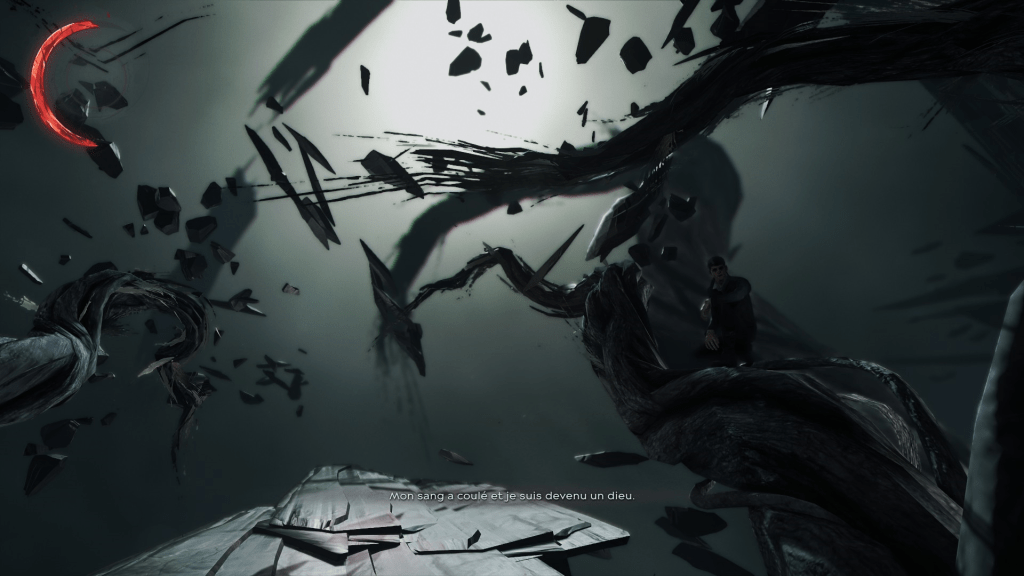 Pour conclure, l’Outsider est à mes yeux la plus belle incarnation de l’Etranger, dans tout ce qu’il a d’inquiétant et de fascinant. Absolument neutre et détaché du monde, il joue un rôle de dieu curieux. Le définir est compliqué car il est en permanence dans un entre-deux : mortel/dieu, issu du passé/intéressé par l’évolution du temps, il offre des dons mais se moque de l’utilisation que l’on en fait… L’Outsider lance vraiment le jeu quand il offre sa marque à Corvo mais il demeure étonnamment en retrait pendant le reste de l’aventure. Il ne se manifeste que pour faire douter du chemin emprunté; il ne faut pas voir sa marque comme un présent, mais comme un moyen qu’il utilise pour satisfaire sa curiosité. A l’image de ce qu’il représente, l’Outsider est mouvant, difficile à cerner : il est un mythe sans cesse réadapté.