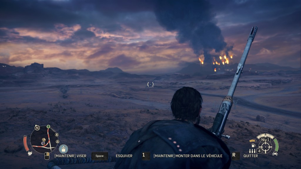 Maximilien Rockatansky de son vrai nom était un superflic avec que l’apocalypse ne démarre. Depuis, il erre dans un désert sans borne en luttant pour sa survie. Dans le jeu, la folie de Max est montrée par le biais d’un personnage semi imaginaire qui permet au joueur de monter de niveau qui apparait et disparait comme par magie. Néanmoins, il reste un poil d’humanité dans le personnage dans sa relation avec une esclave (Hope) et sa fille à qui il rend des services. Mais il demeure un monstre malgré tout. Un monstre qui utilise tout ce qui lui tombe sous la main (barre de fer, coupecoupe, lance explosive) pour couper, trancher ou empaler ses ennemis. Le joueur dispose d’un bon nombre de combos au corps-à-corps et peut profiter de temps à autre d’un fusil à canon scié et de surins. Charmant, n’est-ce pas ? Ha ! j’ai oublié de vous parler du fusil de sniper à l’arrière de sa voiture… qui peut être elle même customisée comme un arme. Bref, on ne manque pas de moyen de se fritter avec les différents adversaires, dont, on peut le regretter, l’IA a un peu fondu au soleil. Il est évident que Max est un anti-héros, qu’il ne compte pas sauver le monde ou ce qu’il en reste.