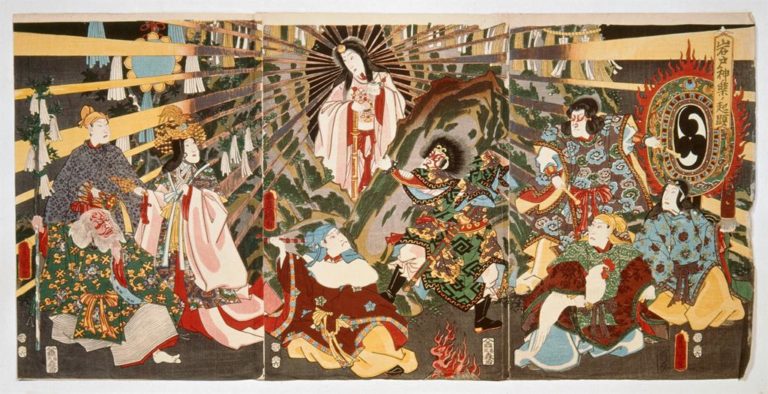 Au-delà des spécificités de chacune de ces images, tisser des liens entre elles permet de comprendre l’étroite relation qu’entretient Ōkami avec les récits d’antan et la manière dont le jeu, qui se veut une estampe en mouvement, rend hommage aux représentations qui le succèdent. Les estampes de Shunsai TOSHIMASA et d’Utagawa KUNISADA [images 2 et 3] restent fidèle à la scène telle que présentée par la légende : selon le Kojiki (Chronique des faits anciens), la mauvaise conduite de Susanoo, le dieu japonais des tempêtes, amène sa sœur Amaterasu à se cacher dans la grotte Ame-no-Iwato ( 天岩戸 signifie littéralement « grotte de la déesse du Soleil » ou « grotte céleste »). Face à une terre qui se voit ainsi privée de lumière, faire sortir Amaterasu de la grotte pour chasser l’obscurité devient une nécessité. Pour ce faire, les dieux organisent une fête sur l’idée d’Omoikane (déité de l’Intelligence, de la réflexion et du conseil avisé). Entendant des éclats de rires, Amaterasu, curieuse de connaître la source de cette joie, regarde l’entrée de la grotte. La voilà fascinée par son propre reflet dans le Yata no Kagami, miroir que les autres dieux ont conçu et accroché devant la grotte à cet effet, et que l’on perçoit à droite des deux estampes. Amaterasu pétrifiée, Ame-no-tajikarao force alors l’ouverture de la grotte et le monde baigne de nouveau dans la lumière : c’est l’instant précis de cette dernière scène que saisissent nos deux œuvres, représentant Amaterasu bien au centre de l’image et surélevée par rapport aux autres personnages, et de laquelle surgissent des rayons venant rétablir la lumière sur un monde jusqu’alors dépourvu d’éclat. Les développeurs du jeu Ōkami, dans la cinématique de début [image 1], prennent également soin d’insérer la déesse au centre de l’image, laissant briller autour d’elle ses rayons comme pour rendre manifeste l’arrivée d’une lueur d’espoir dans un Nippon dont les couleurs grises, rouges et mauves soulignent par leur tonalité sombre un pays en proie à une obscurité dévorante. Le jeu développe néanmoins des particularités vis-à-vis de ses successeurs : Amaterasu y apparaît sous une forme animale, et non humaine, tandis qu’elle ressuscite dans une statue ; il n’y a donc pas de grotte, et un seul personnage assiste à son éveil – Sakuya, esprit des Forêts – , et non plusieurs. Ces divergences par rapport aux éléments du conte initial parviennent pourtant à faire écho à la scène mythique : la statue de pierre dans laquelle s’incarne Amaterasu pour faire à nouveau briller ses rayons sur le Nippon évoque par sa matérialité celle de la grotte, tandis que le miroir qu’utilise Sakuya pour réveiller la déesse est bien présent.