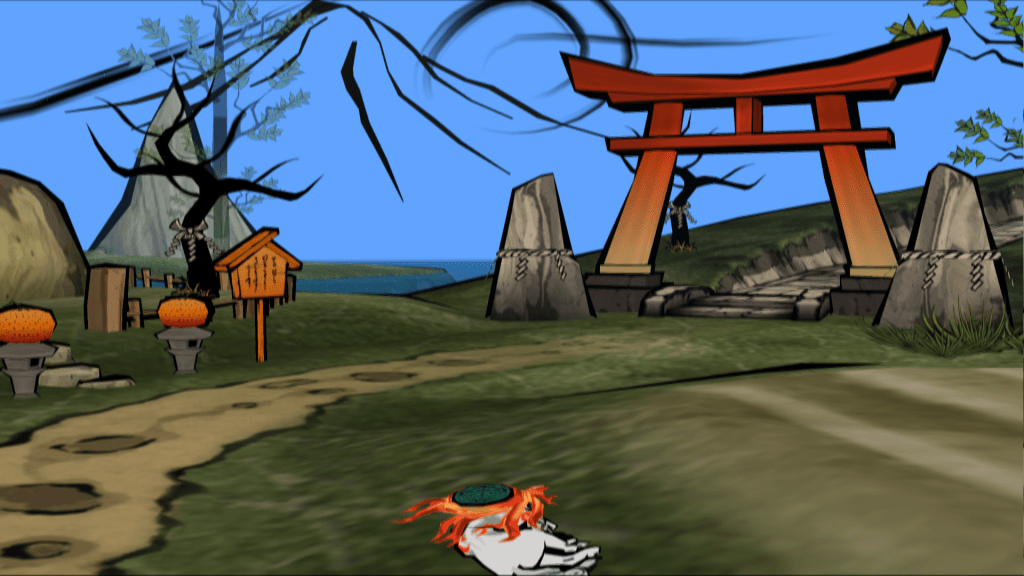 Les deux images dessinent à l’horizon les contours minimalistes et évanescents d’un mont Fuji pourtant prédominant, surplombant par sa taille et sa posture surélevée les éléments qui l’entourent. Les [images 14 et 15] possèdent, à peu près, la même composition : au premier plan, un village, quelques arbres et un torii (portail japonais), dont la petitesse est soulignée par l’imposante présence du mont Fuji au second plan. Ōkami ne manque ainsi pas de faire sa propre référence, purement illustrative, au mont Fuji, qui envahit l’imaginaire japonais. La présence du mont Fuji est d’autant plus prestigieuse que le reste des lieux du jeu est purement fictif, faisant de ce lieu célèbre le seul référent réel d’Ōkami.