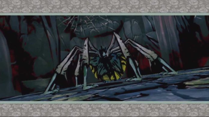 Les [images 10 et 11] sont ainsi intéressantes à mettre en parallèle puisque chacune représente le moment précis qui précède le début d’une lutte contre un démon, ici une immense araignée, dont le territoire est marqué par la présence d’une imposante toile symbolisant le piège et l’impossibilité de fuir la bataille imminente.