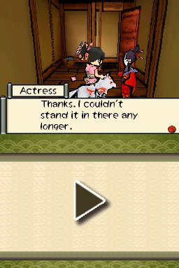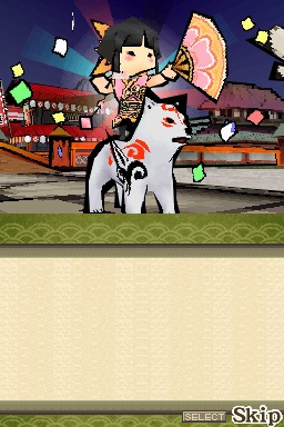 Les différentes images mettent en avant toute la beauté et la grâce des acteurs munis de leurs somptueux kimonos et arborant de sublimes coiffures. L’[image 9] met en avant des acteurs de kabuki en plein jeu : à Edo, la capitale du Japon, après le « quartier réservé » du Yoshiwara et ses courtisanes, le théâtre de kabuki est le second pôle d’attirance pour les artistes de l’ukiyo-e. Le jeu Ōkami n’insère pas de référence à l’univers du théâtre ; c’est pourquoi je me suis orientée vers sa suite sur Nintendo DS, Ōkami Den, dans laquelle un théâtre est présent, construit après le départ d’Amaterasu pour la Plaine céleste. Si le jeu Ōkami Den ne fait pas explicitement référence au théâtre kabuki, on ne peut passer à côté de l’existence de l’univers théâtral dans un jeu qui se veut être une estampe en mouvement capable de saisir les différents éléments de la vie quotidienne et artistique.