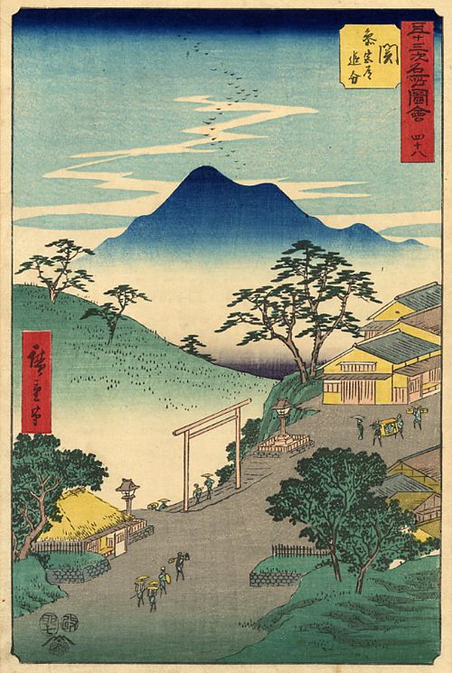 Avec l’assimilation progressive de la perspective de la peinture occidentale par les artistes japonais à la fin du XVIIIème siècle d’abord, puis surtout au XIXème siècle, notamment à travers le travail de HOKUSAI et HIROSHIGE, l’ukiyo-e se dote de la technique nécessaire à la représentation des vues célèbres du Japon, le fūkei-ga. Appuyés sur le concept des meisho-e, l’un et l’autre se lancent alors dans la réalisation de longues séries décrivant les plus beaux sites japonais.