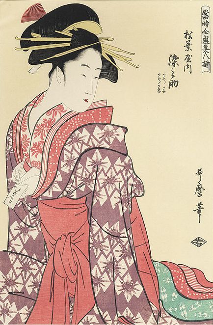 Les deux femmes représentées sur ces images ne proviennent pas de la même catégorie sociale: si Somenosuke de Matsubuya [image 5] est une courtisane évoluant dans un milieu urbain (la maison Matsubuya était l’un des établissements de plaisir le plus grand du Yoshiwara, le quartier des Maisons vertes, c’est-à-dire des maisons closes, de Tokyo), Kushinada [image 6] , jeune fille encore vierge, est une paysanne fabriquant du saké dans le petit village fictif de Kamiki. La mise en parallèle de ces deux représentations est néanmoins intéressante malgré leurs divergences. Les [images 5 et 6] soulignent le rôle de la coiffure et du kimono dans le portrait des jeunes femmes. En effet, à la beauté de la femme, le bijinga associe celle de son kimono, dont la splendeur et le raffinement sont indissociables de l’attrait qu’elle exerce : les deux femmes présentées sur ces images font ainsi toutes deux l’objet des convoitises d’un homme, Somenosuke ouvrant discrètement une lettre qui peut être celle d’un amant [image 5], tandis que Kushinada s’apprête à être sauvée, dans la scène choisie [image 6], par le guerrier Susano qui s’est entiché d’elle.