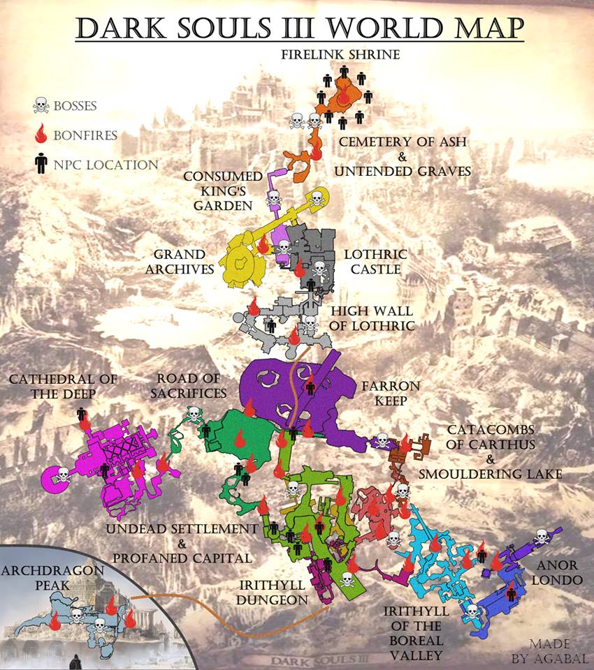 Dark Souls a développé un level design très ingénieux sans recourir à l’habituel hub central un peu passé de mode. Au fur et à mesure du jeu, on débloque des escaliers, des murs illusoires, des portes qui ne s’ouvrent que dans un sens, tout un tas de raccourcis qui permettent au joueur de s’y retrouver facilement. Et comme le souligne bien Alt236 : chaque niveau prépare le prochain si bien que les transitions entre les niveaux ne sont parfois rendus seulement visibles par le nom du lieu qui s’affiche. C’est comme si un seul level designer avait tout fait tant les lieux regorgent de détails et la cohérence sont fascinants.