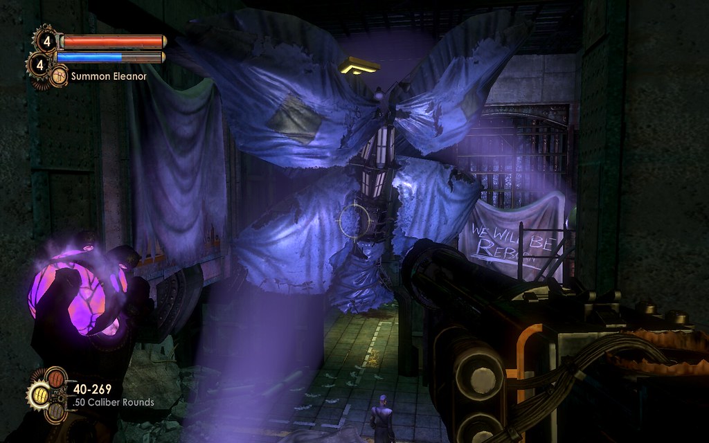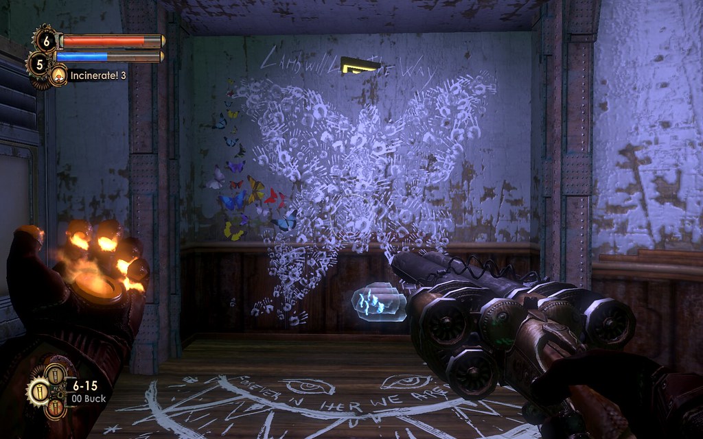 De l’autre côté de l’affiche généralement officielle ou émanant d’une instance reconnue se trouve le tag sauvage. Dans Bioshock 2, on retrouve les affiches de propagandes mais aussi des tags de papillon à divers endroits. Dans sa symbolique, le papillon représente l’esprit, rien de bien étonnant quand on sait que ces tags sont fait par un culte réuni autour d’une psychanalyste. Ces tags peuvent être des signes de reconnaissance, des revendications, des contournements de la loi initiale. Dans Bioshock 2, ils indiquent le renouveau de Rapture qui essaye de se redresser après sa chute, les tags sont le symbole d’une nouvelle prise de pouvoir, après le règne d' »Atlas » et de l’ultralibéralisme.