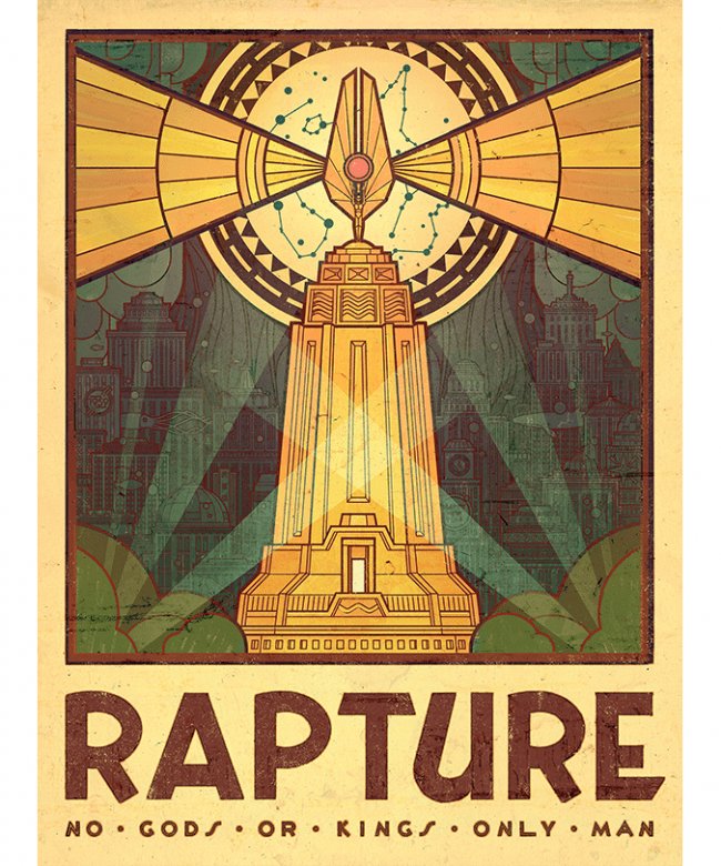 Les affiches dans Bioshock sont savamment imitées à partir d’affiches du passé à tel point que l’on pourrait les confondre avec de vraies datant de la première moitié du XX° siècle. Si certaines évoquent les affiches révolutionnaires russes, d’autres font plus penser à celles qu’a fait Mucha. Ce qui est particulièrement bien réussi dans Bioshock, c’est que les affiches -assez nombreuses- semblent faire partie du monde du jeu.
