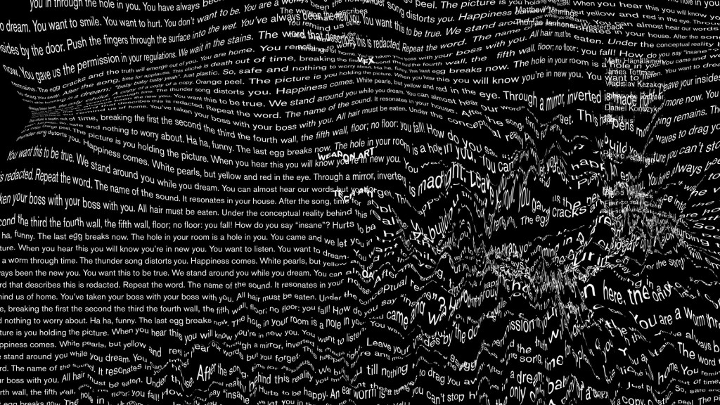 Vers la fin du jeu se trouve un faux générique de fin qui se met de plus en plus à buguer jusqu’à la plus pure distorsion avant de littéralement s’effacer. Cela crée un vrai choque chez le joueur qui ne s’y attend pas mais fait aussi penser à La Maison des feuilles (2000), le premier roman de Mark Z. Danielewskiet et sa typographie folle.