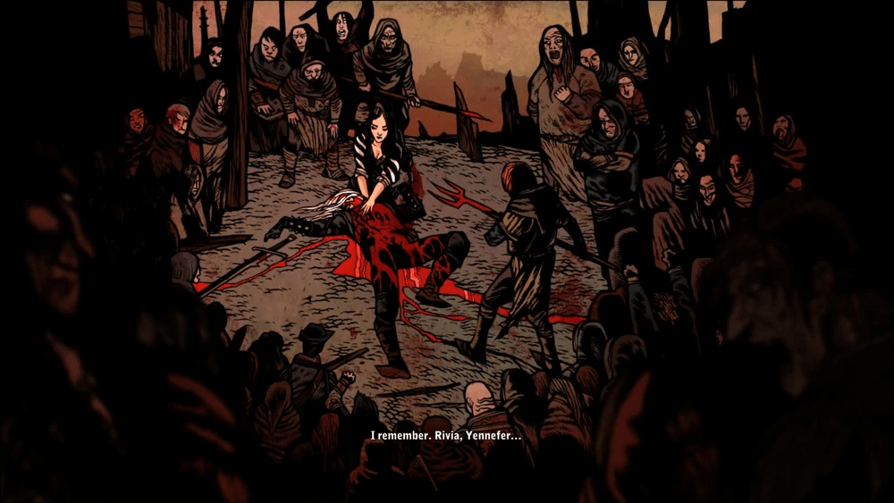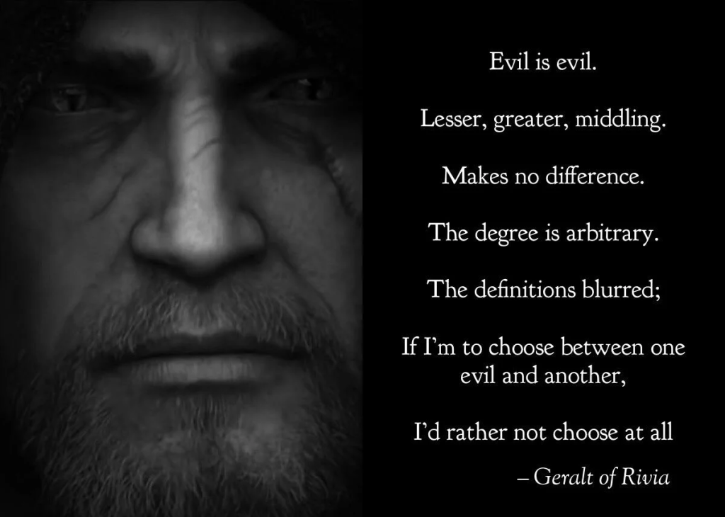 Encore une fois, le sorceleur est montré comme un monstre avide d’or et sadique. Les sorceleurs apportent une peur ancestrale, aussi bien chez les Hommes que chez les monstres. Pourtant, dans le cas de Géralt de Riv, c’est presque le contraire des deux portraits dressés, il porte le récit sanglant d’une quête désespérée d’une humanité perdue. Aussi Nenneke affirme à Géralt qu' »il devrait être évident [qu’il] ne sera jamais jamais un être humain, et pourtant [qu’il] cherche indéfiniment à l’être. En commettant des erreurs humaines. Des erreurs qu’un sorceleur ne devrait pas commettre.«