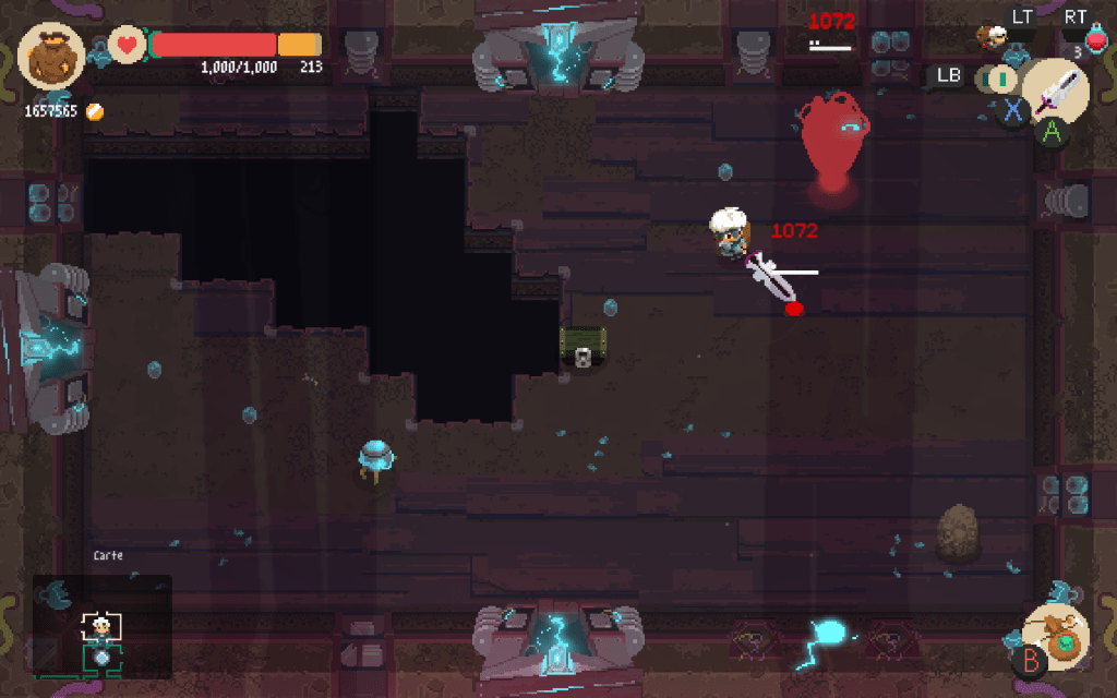 Will, à l’instar des super-héros, mène une double vie; le jour, il est un marchand tout ce qu’il y a de plus banal mais la nuit, armé et cuirassé, il pénètre dans les terribles donjons pour y récupérer les précieuses reliques qu’il vend durant la journée. Les deux gameplays se chevauchent habilement et sont tous deux qualitatifs. Quand on vend la journée, il faut bien disposer ses stocks, trouver le juste prix en fonction des réactions clients, empêcher les voleurs de piller notre précieuse marchandise, obtenir les bons objets pour les commandes passées… Mais le jeu de gestion se transforme en rogue-lite la nuit. Choisissez votre amure et vos armes, améliorez-les chez le forgeron, faîtes le plein de potions de soin et c’est parti pour les donjons ! Il est intéressant de noter que le côté gestion survit toujours dans ce second gameplay: votre inventaire est limité et rapidement, il faudra faire un choix entre les objets que l’on garde et ceux que l’on jette car inutiles ou trop peu rentables. Les donjons peuvent s’avérer redoutables et si l’on tombe sous les coups des monstres, tout notre trésor durement constitué disparait et on rentre bredouille. Par ailleurs, les donjons renferment des secrets qui attise l’attention du joueur. On y trouve par exemple des salles cachées dans des gouffres, des cabanes d’anciens aventuriers, des messages laissés par les civilisations des donjons ou encore des sources thermales pour se reposer et récupérer quelques points de vie.
