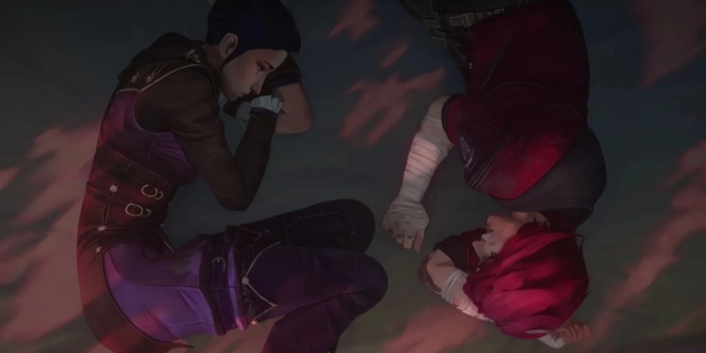 Pour en finir avec l’aspect politique, il est essentiel de souligner qu’une bonne partie de l’action est portée par des personnages féminins, bien plus nombreux que les hommes. En effet, les femmes ont un rôle scénaristique plus important. On peut dire que c’est rafraichissant de voir des femmes tirer les ficelles d’un scénario sans qu’elles soient reléguées à des rôles dépendants d’hommes. Ces femmes sont toutes, à leur manière, fortes tout en laissant apparaître des cicatrices profondes ou des points faibles. Il n’y a à aucun moment de l’idéalisation !, au contraire, comme dit plus haut, tout le monde est extrêmement humain. Elles n’occupent pas forcément des rôles où on a l’habitude de les voir (épouses ou mères par exemple) et entretiennent entre elles des relations compliquées et variables. Par exemple, le duo formé par Vi et Caitlyn est un odd couple, c’est-à-dire un binôme inattendu tant tout les sépare. J’en prends à témoin un moment de complicité que les deux partagent dans la chambre de Caitlyn alors que pourtant elles sont dans des positions similaires mais opposées, à la façon d’yin et d’yang. Pourtant, les deux vont finir par bien s’entendre au point de se sauver mutuellement la vie et se battre côte à côte. Fait amusant, leur différence se retrouve même dans leur façon de combattre, Caitlyn, en tant que pacifieur, utilise une arme à feu et Vi privilégie ses poings. Ce duo n’est pas non plus une innovation de la série puisqu’on avait eu l’opportunité de les voir combattre ensemble dans une vidéo de 2020.