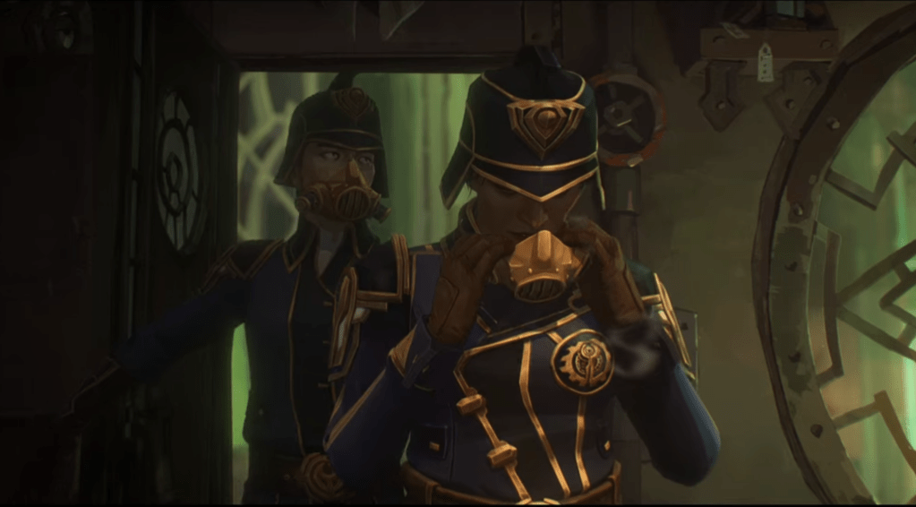 Un élément intéressant à noter est l’utilisation du masque et de la capuche. Selon moi, cette utilisation reflète parfaitement les relations de classe entre la haute ville de Piltover et les bas-fonds de Zaun. Les masques sont utilisés par les pacifieurs, unité de gardiens de la paix/militaires utilisée par Piltover pour garantir la sécurité et réprimer les émeutes ouvrières. A chaque fois que ces personnes se rendent dans la ville basse, elles portent un masque à gaz qui recouvre le bas du visage. On peut expliquer ce comportement par le fait que l’air de Zaun est particulièrement pollué par les rejets de Piltover issus de l’activité industrielle et chimique (charbon, métaux lourds etc…). C’est pour se protéger de ces miasmes que les soldats portent ces masques. Ils marquent cependant une relation politique et sociale : la population pauvre est laissée à son compte, empoisonnée par ce qui permet le confort des plus riches, tandis que ces derniers se protègent des effets néfastes du progrès. Ce masque, élément d’apparence insignifiant reflète pourtant un mépris de la classe supérieure qui préfère se protéger plutôt que de prévenir le mal, quitte à laisser sur le bas-côté toute une partie de la population. A l’inverse, la capuche cache le haut du visage et est utilisée par les couches inférieures de la société lorsqu’elles se rendent dans la haute ville pour commettre des larcins. Cette capuche est surtout utilisée par Vi pour se dissimuler mais le principe est similaire aux masques utilisés par les freedom fighters d’Ekko.