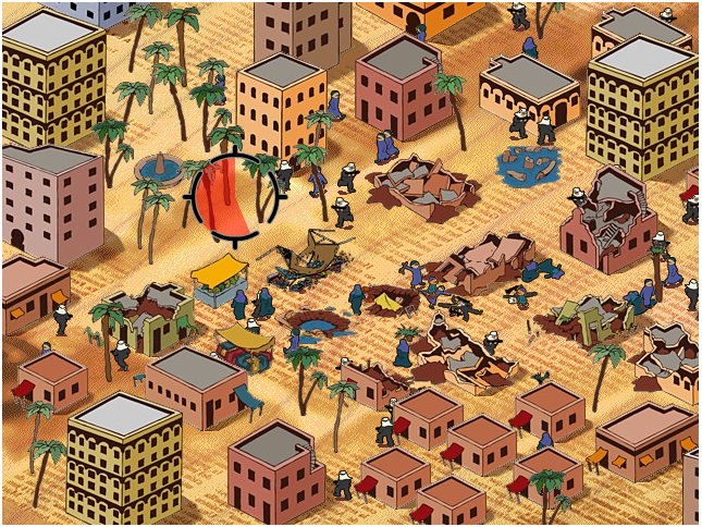 Appliquer une grille de lecture aux jeux-vidéos, tout comme aux médiums artistiques, est une tentative mort-née. Rien n’est assez souple pour capter l’essence d’un jeu et assez rigide pour être applicable à tous les jeux. Alors, il reste le joueur et sa posture. Quand on joue à un jeu pour la première fois, il faut une certaine posture. Celle-ci peut être rapprochée de l’ironie socratique. Celle-ci ne consiste pas à se moquer mais à établir une distance faussement naïve pour feindre l’innocence. De cette manière, on peut voir jusqu’où le jeu va aller dans sa proposition, s’il saura la radicaliser ou s’il va l’abandonner en route. En faisant semblant de découvrir les tenants et aboutissants de la thèse adverse, on prend du recul, on ne se laisse pas absorber par ce qui nous est proposé : c’est le premier pas vers la pensée, le fond d’un jeu. Se laisser prendre dans un jeu sans avoir de recul revient in fine à ne pas vraiment apprécier le jeu pour toute la richesse qu’il propose. Le recul ironique permet de se rendre compte de ce que le jeu veut dire. Dans September 12th : A Toy World sorti en 2003, le joueur incarne un artilleur américain à bord d’un gunship chargé de faire pleuvoir des bombes sur les terroristes en représailles aux attentats du 11 Septembre. Sans recul, on est incapable de comprendre que le jeu dénonce justement ce que le joueur fait. En effet, chaque bombe touche forcément des bâtiments et des civils. Dès qu’un personnage meurt, les civils aux alentours vont pleurer sur son cadavre et se transformer en terroristes pour le venger. Dès la première bombe larguée, le jeu est fini, le joueur a perdu puisqu’au final, tous les civils se changeront en terroristes et les bâtiments seront détruits. Sans recul ironique, un joueur aveugle aurait l’impression de jouer à un énième jeu patriotique américain où tous les arabes sont des méchants sans se rendre compte que la force du jeu réside dans un concept d’une simplicité brillante : le joueur joue contre lui-même. « La violence entraîne la violence » semble être le maître mot de ce jeu où pour gagner, il ne faut pas jouer. Par un recul ironique, on se rend compte que le jeu n’a pas fait de compromis avec son idée de base et qu’il a su la radicaliser au maximum. L’ironie pose la question des limites des propositions d’en face, mais peut aussi questionner l’action du joueur dans le monde au sein duquel il joue. Un décalage, un recul nécessaire pour voir jusqu’où le jeu va tenir son idée et pour comprendre ce que fait le joueur.
