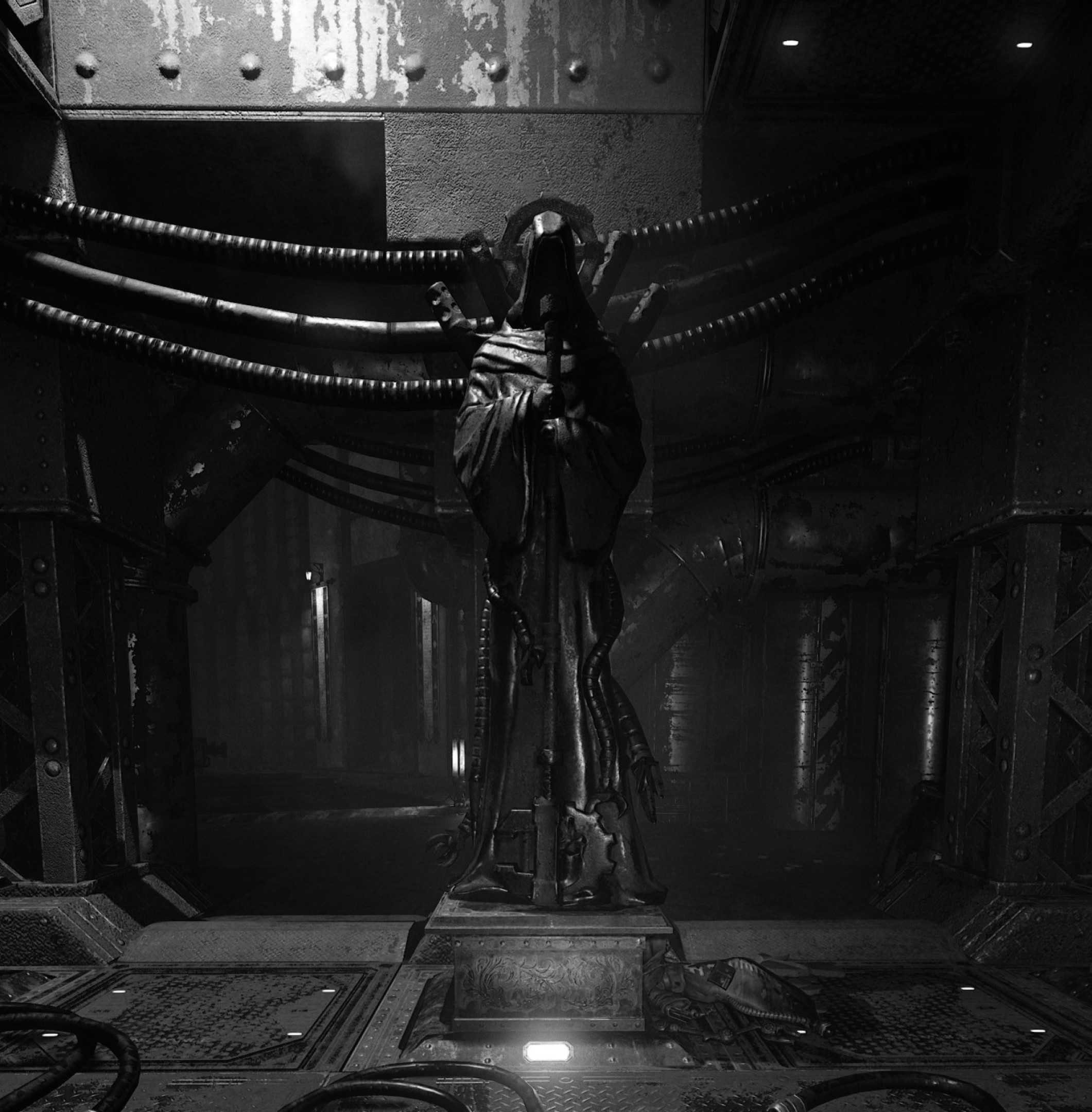 L’Impérium humain puise, avec sa statuaire, dans le monde antique, tout en exagérant le tout. Ainsi, Dans Necromunda : Hired gun (Streum On Studio, 2021), de monumentales statues ornent de nombreux bâtiments Dans la série Angels of Death (2021), la première chose que voient les Blood Angels lors de leur déploiement est une énorme statue d’une Adepta Sororita et ce genre d’exemples pourrait être multiplié à l’infini. Avant de poursuivre dans mon raisonnement, il faut se pencher sur la statuaire antique à laquelle fait sans arrêt référence l’univers de Warhammer 40k. Les statues de l’Antiquité étaient pensées de manière à représenter l’éternité, l’immobilité. Même les représentations du mouvement sont figées dans un instant noble, dans un équilibre que rien ne semble pouvoir briser. On peut opposer cette esthétique de la magnificence à la dissymétrie et au déséquilibre du baroque bien qu’il ne faille pas non plus radicaliser l’opposition. L’immobilité immuable apparente du classicisme a souvent été utilisée comme modèle pour définir le genre noble. La blancheur du marbre -alors que les sculptures antiques étaient peintes…- à laquelle est associée l’idée de perfection, tant morale que physique, a contribué à faire de ce style une incarnation de l’art immortel des grands Anciens, souvent injustement opposé à une « décadence moderne » et c’est précisément ce que semblent souligner avec ironie les créateurs de Warhammer : les gigantesques statues altières tombent en ruine, recouvertes par les détritus, les tags quand elles ne sont pas simplement oubliées. Au pied des œuvres monumentales et grandiloquentes remue une foule nombreuse, parfois difforme et corrompue, aux vêtements rapiécés et à la vie incertaine, jurant avec la pureté et le regard planté dans l’infini de l’horizon des hommes de pierre. A la façon de l’art renaissant du XVI°, il y a un véritable décalage entre ce qui est montré et ce qui est le quotidien des sujets de l’Impérium. Pensées comme inspirantes et fortifiantes par ceux qui les ont crées, les statues immenses sont parfois utilisées comme cristallisation de ce qu’il faut haïr : l’autorité autoritaire, les super soldats de l’Empereur.